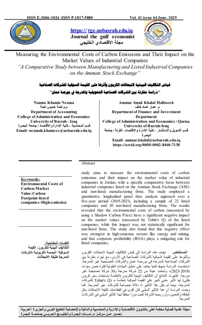 Measuring the Environmental Costs of Carbon Emissions and Their Impact on the Market Values of Industrial Companies “A Comparative Study between Manufacturing and Listed Industrial Companies on the Amman Stock Exchange”